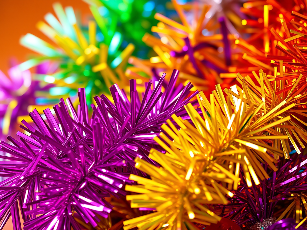 Tinsel is a shiny, metallic garland which is used to decorate the Christmas tree. You may also see it on pictures, or wrapped around things such as the banisters on staircases.